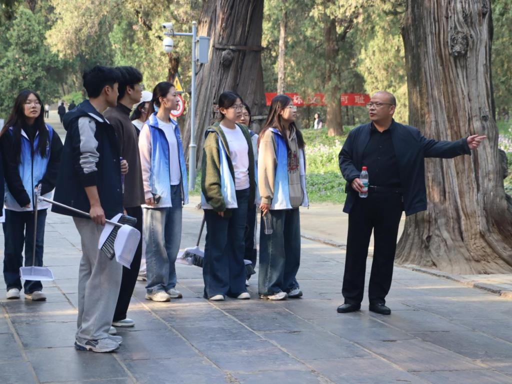 活动当日,志愿者统一集结,领取清洁工具。负责人就活动流程、注意事项、文物保护要求及任务分工作出详细说明。抵达孔林后,田保兵围绕孔林的历史沿革与文化内涵进行讲解,引导志愿者深入理解文化遗产的时代价值。志愿者们秉持对文物的敬畏之心与保护之责,手持扫帚、簸箕等工具,分工协作,对孔林路面、绿化带等区域的垃圾杂物进行全面清理。活动全程严格遵守文物保护准则,不触碰文物、不进入非指定区域,展现了曲师大学子良好的精神风貌。清扫结束后,志愿者有序整理工具、集中处理垃圾,经现场检查确认后统一返程,活动秩序井然。