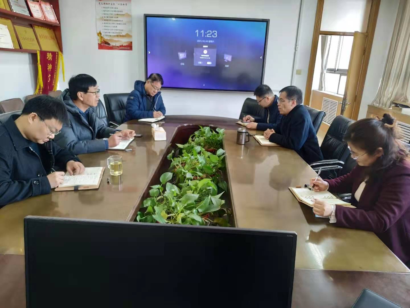 在会议室召开党政联席会议,安排新学期开学准备工作。富贵险中求
