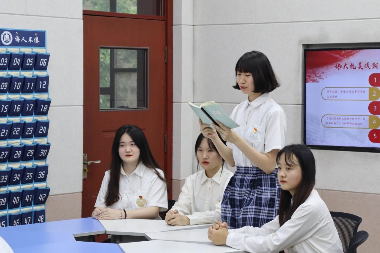 本次活动以伟大的抗美援朝精神为中心展开学习。活动开始,通过《长津湖》片段的播放,同学们感受抗美援朝战争胜利的来之不易。通过现场演绎与英雄人物杨根思连长的对话,生动形象地展示了志愿军将士们在抗美援朝战场上不畏强敌、英勇斗争的故事。随后的合唱英雄赞歌、配乐诗朗诵等环节,更是将活动现场的氛围推至顶峰。在交流心得环节,党员戚嘉禾表示,作为新时代青年,要不忘历史,珍惜今天幸福生活,永远保持和发扬革命先烈精神,让先烈们用生命和鲜血换来的江山永不变色。最后范瑞红带领大家重温了习近平总书记对青年的殷切嘱托,号召同学们从点滴细节上培养高尚的道德情操和浓厚的爱国情感,用心传承红色基因,赓续共产党人的精神血脉。