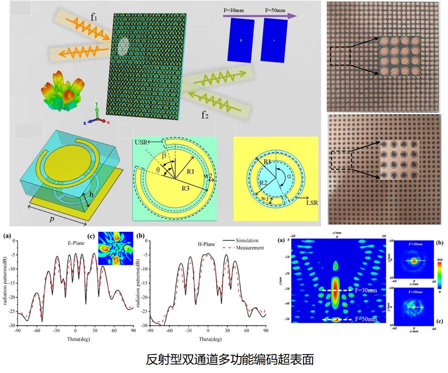 随着通信技术的快速发展,传统单一功能的电磁器件已无法满足日益复杂的需求。团队利用反射与透射技术进行电磁波前调控,专注于特征模分析与编码超表面研究,集成RCS缩减、涡旋波束、聚焦、异常偏折等功能。同时,探索空间、极化及频率复用策略,不断拓展超表面功能,为电子设备的小型化、集成化提供广阔应用前景。