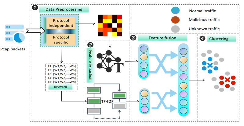 聚焦现有加密恶意流量检测方法在未知威胁识别上标签准确率不足、实时性能不佳的问题,设计了一种无监督实时检测系统HyperEye,同时提取、融合协议无关的数值特征与协议相关的文本特征,实现对多维度流量行为的深度融合与全面描述。提出一种基于遗传算法的DBSCAN参数优化方法(GA-DBSCAN),自适应调整聚类参数,有效识别未知恶意流量模式,提升检测质量与稳定性。