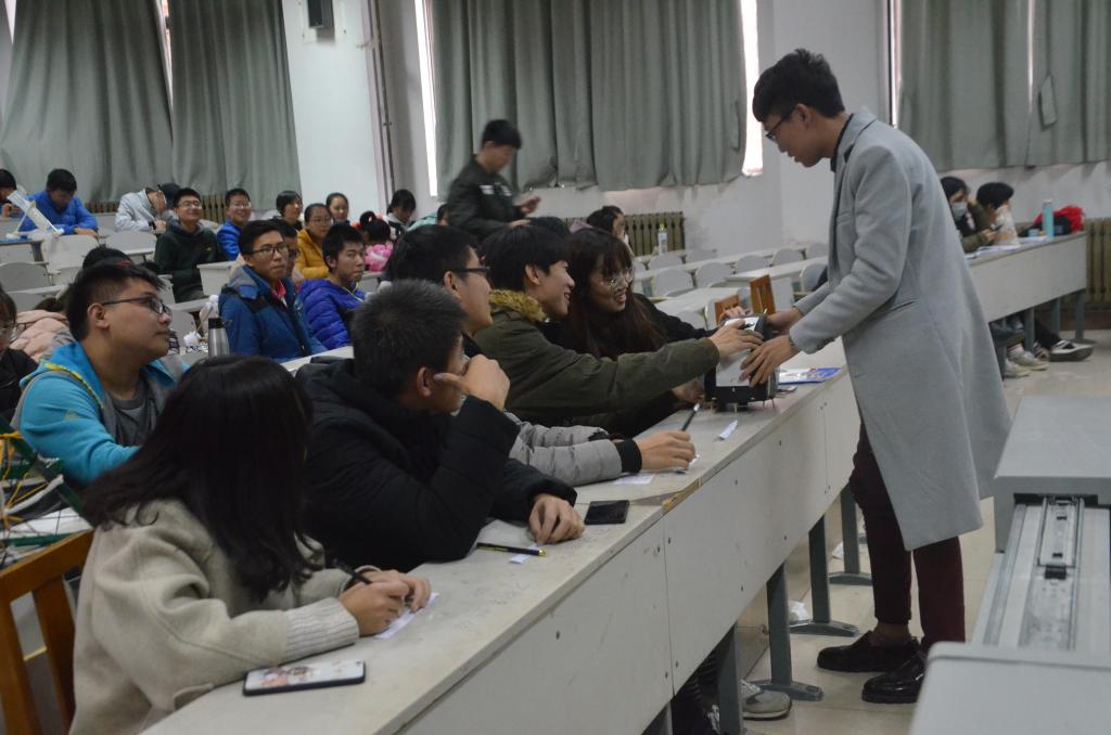 比赛中,每组选手各派一名代表上前利用ppt或其他方式对自己组的作品进行材料、性能等方面的讲解,并将作品展示给评委观看。随后参赛组携带作品到指定地点进行鸡蛋抛掷,由指定人员和其余参赛组队伍在一旁进行观看,评委根据参赛作品的外观、设计技巧、重量以及鸡蛋的落地情况等方面进行打分。本次比赛陈震、张金垣、王天宇带领的队伍荣获一等奖,另有四支队伍获二等奖,五支队伍获三等奖,评委们为获奖组颁奖并与他们合影留念。