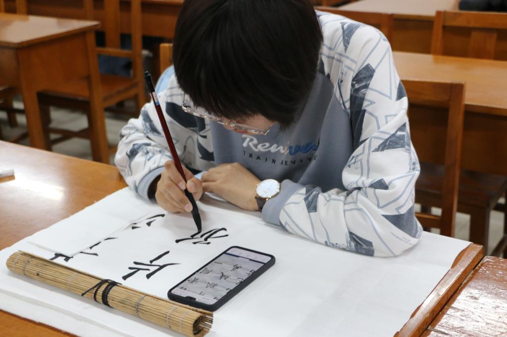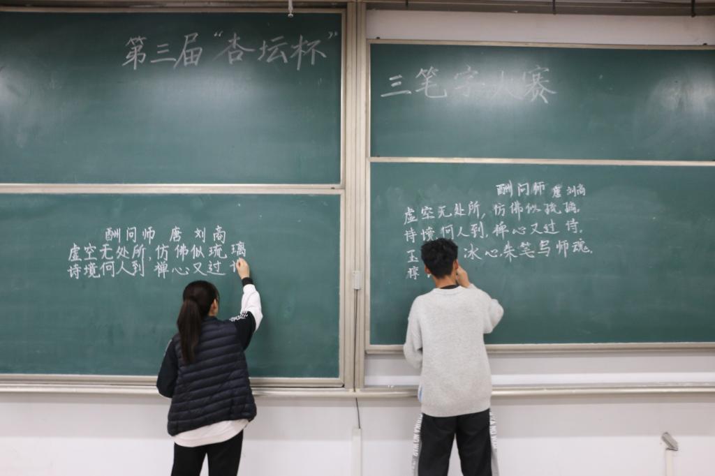 杏坛杯书法比赛分为钢笔、粉笔、毛笔三部分,参赛者可任选其中一项进行展示。在浓厚的书香氛围下,参赛者逐渐进入书写的最佳状态,他们拿起钢笔,将自己的感情融入一笔一划,行云流水间,展现出了中华书法的魅力;他们拿起粉笔,走向讲台,粉尘飘扬间,完成了一首首端庄秀气的诗文;他们提起毛笔,在宣纸上挥毫泼墨,全神贯注,一幅幅作品完美展现,在淡淡的墨香中,比赛落下了帷幕。