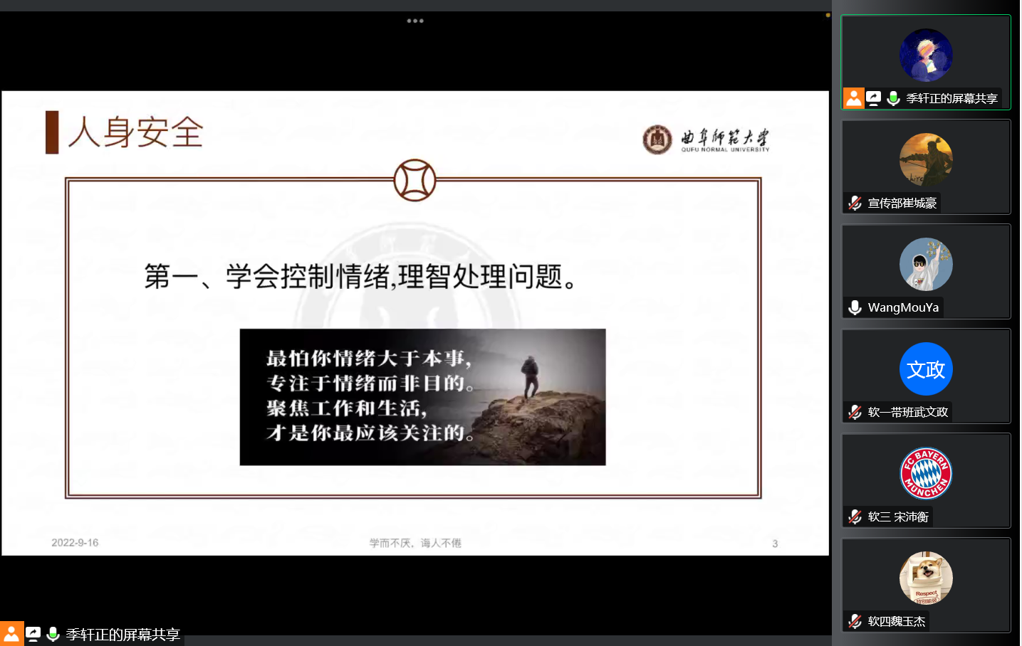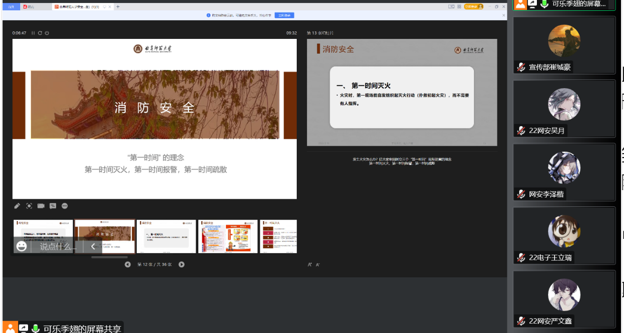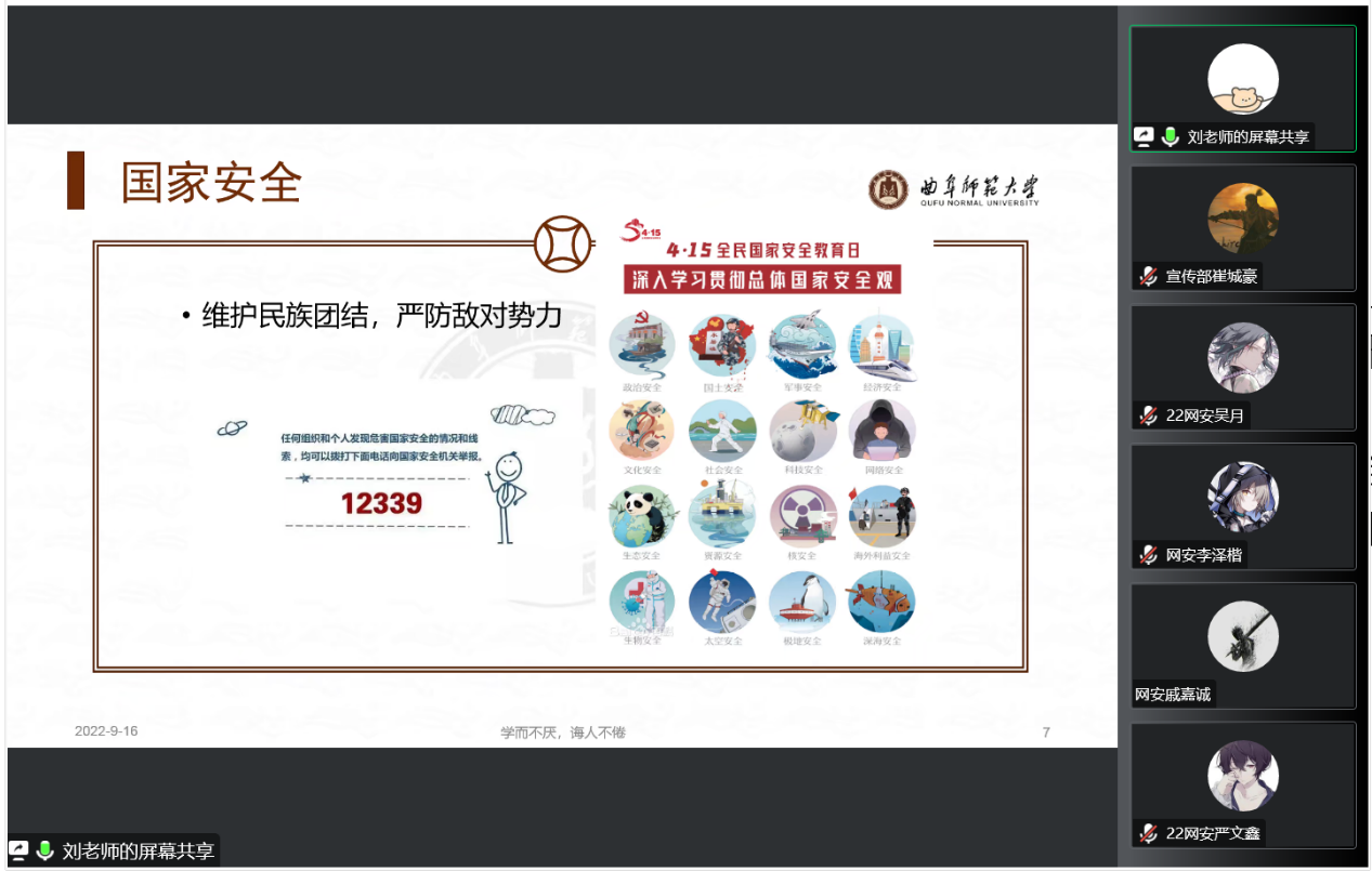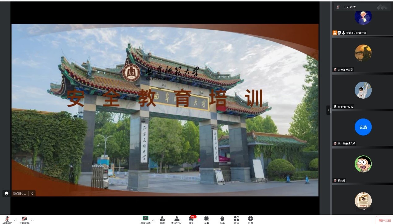 于线上举行了新生安全教育会议,校保卫处刘淑朋老师担任主讲人,辅导员相青、学生会主席季轩正及22级全体新生参加本次会议。