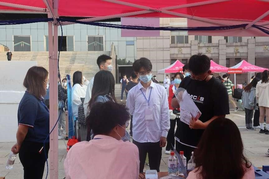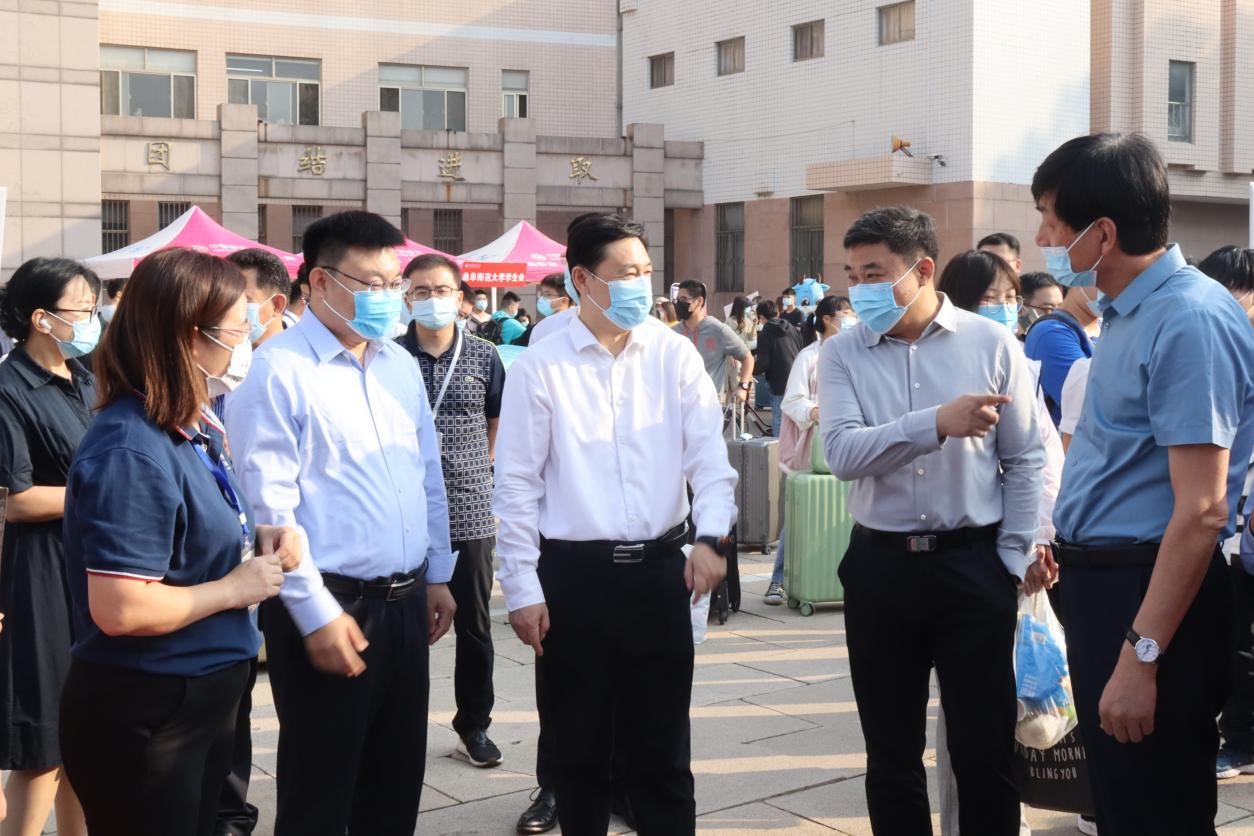 党委书记田云飞,院长王茂励,党委副书记范瑞红带领团委书记丁允念,辅导员相青、洪亚玲、于媚媛、武玉龙、李扬,亲临迎新现场指导视察工作,并慰问2022级新生。