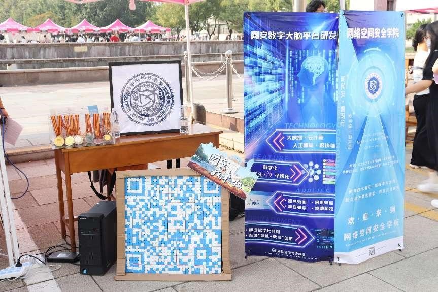 联合下设各个社团以独具特色方式来欢迎新生报到:展现软件类学科和电子类学科专业特点的由代码和嵌入的电路板制作的展板、由魔方社团通过魔方拼接制作而成的二维码、剪纸社团用精巧的双手剪刻出的院徽……各式各样的展品为迎新工作增光添彩,展现了富贵险中求