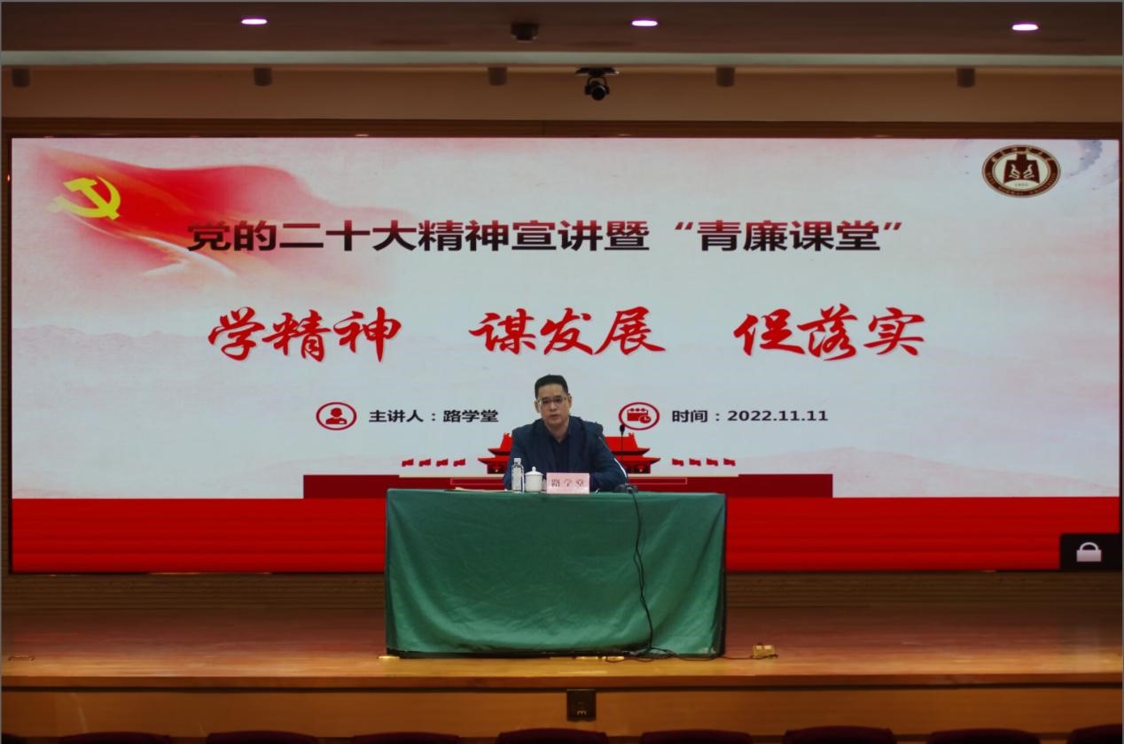路学堂结合自己的学习和感悟,从党的二十大主题、主要成果和重大意义、过去5年工作和新时代10年伟大变革、中国式现代化、坚持党的全面领导和全面从严治党、应对风险挑战等七方面宣讲党的二十大精神。路学堂指出,党员干部要把捍卫“两个确立”、做到“两个维护”落到实处,要抓好全面从严治党各项任务落实,加强高素质干部队伍、人才队伍建设,同时始终保持反腐败斗争高压态势,推动全面从严治党向纵深发展。