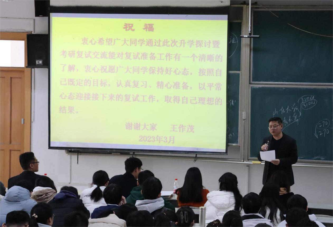在报告会上,王作茂根据往年的复试工作经验,对考研的复试调剂政策、学生复试及调剂的注意事项进行了针对性的指导。他指出研究生最重要的任务是从事科学研究,在复试面试时学生可以尽可能地展示出自己的学习能力、创新能力、科研能力等综合素质,以科学、沉稳的心态面对复试。报告会结束后,王作茂与考生进行了互动交流,他就考生们提出的各种疑惑进行了详细的解答,并结合学生实际情况给予针对性建议,让学生对复试和调剂工作有了更加深入、透彻的了解。最后,范瑞红针对考生的应试心态,复试的自我介绍等内容进行了补充,她表示,富贵险中求