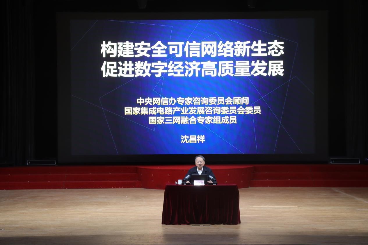 随后,沈昌祥院士作了题为《构建安全可信网络新生态,促进数字经济高质量发展》的报告。他从数字经济时代的机遇与挑战、构建安全可信数字经济保障体系、打造主动免疫可信计算数字产业新生态、加快网络空间安全学科建设和人才培养等四个方面进行阐释,详细介绍了国产化替代的“五、三、一”原则。沈昌祥鼓励同学们,作为新时代的网络空间安全人才,要昂扬奋进练就网络空间安全专业能力,砥砺前行勇攀科技高峰,为实现高水平科技自立自强,建设网络强国贡献自己的青春力量。