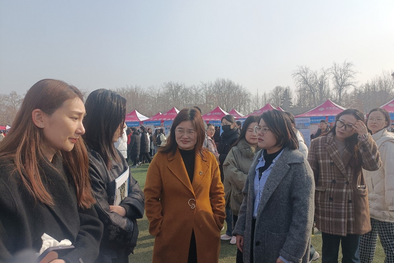 党委书记田云飞、院长王茂励、党委副书记范瑞红以及全体辅导员前往现场走访用人单位,了解当前企业需求和学生的应聘情况。