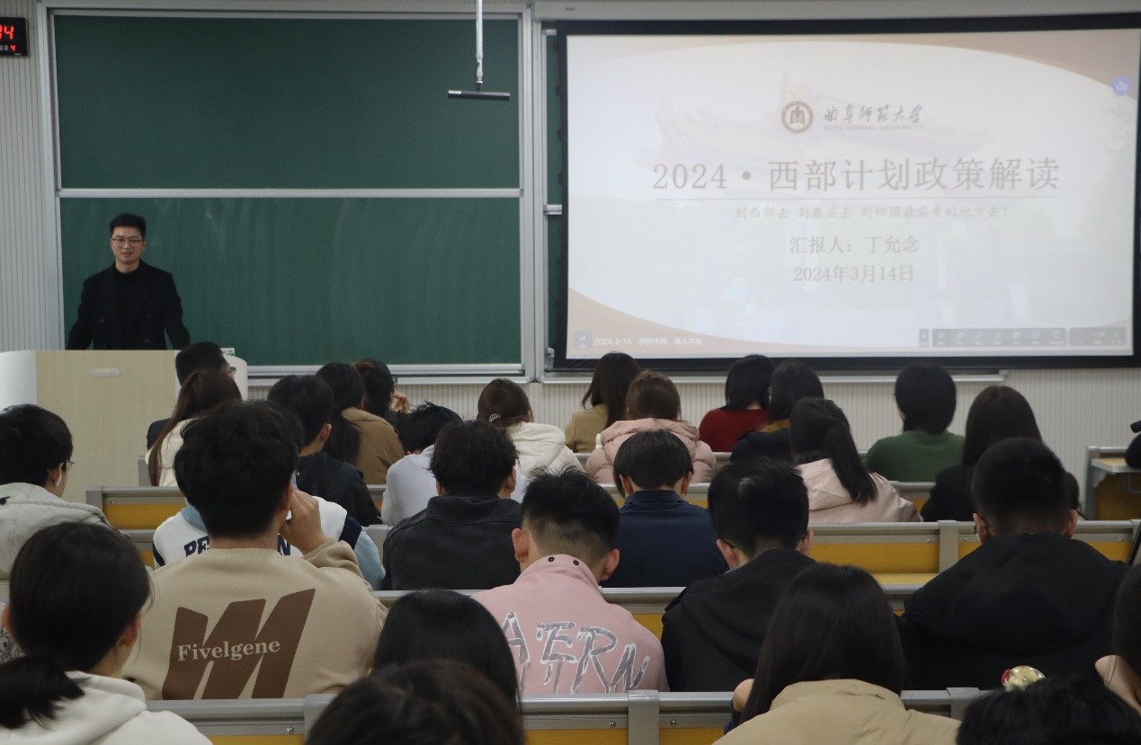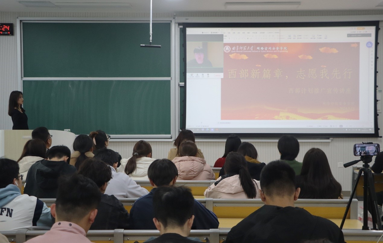 邀请了西部计划的志愿者2023届毕业生张鸿宇通过线上的方式进行了西部计划宣讲,他讲述了自己在西部地区的志愿经历和切身的感受,并向学生们分享了自身的工作环境、生活体验、所面临的困难以及从西部计划中得到的收获。随后,丁允念为大家解读了西部计划的相关政策以及要求,鼓励更多有志青年奔赴西部,投身基层,把梦想扎根在祖国和人民最需要的地方。最后,范瑞红鼓励学生们积极参与西部计划,充盈个人成长经历,为以后的就业获取优势。