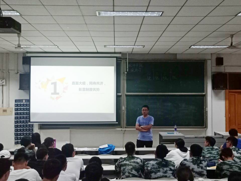 的规章制度,每天填报智慧曲园,上报健康状况,出现发烧、呕吐等不良状况及时上报,并到医院就诊。刚步入大学的软件学子们懵懂无知,对曲园充满好奇,心中疑惑不解,他们向武老师提出心中所疑,武老师对同学们的问题进行了详细的解答,精彩的回答赢得了同学们的阵阵掌声,开学第一课也就此拉下帷幕。