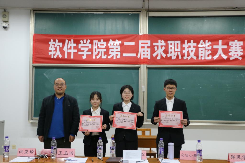 本次求职大赛分为求职简历设计和现场面试两个阶段,初赛阶段评委老师对选手们的简历作品进行初步评审打分,确定复赛人员。进入决赛阶段的选手,按照结构化小组面试方式,参加招聘现场面试,由评委对选手的实际面试情况进行打分。模拟现场面试中,评委们就期望酬薪、频繁跳槽、岗位职责、同事关系、突发状况等问题向选手们进行提问,选手们从容自信、条理清晰地回答了评委老师们的问题,表现优异。王玉田和公冶小燕老师先后对选手们的表现进行了细致的点评,强调了同学们要明确求职目标,同时指出了同学们缺乏开发经验等缺点,希望同学们重视新技术的学习并提高表达能力。经过紧张又激烈的比拼,按照初赛成绩40%、复赛成绩60%的比例决出最终名次,评选出一等奖三名、二等奖四名、三等奖五名、优秀奖七名。评委老师们为获奖选手颁发奖品和证书,并合影留念。
