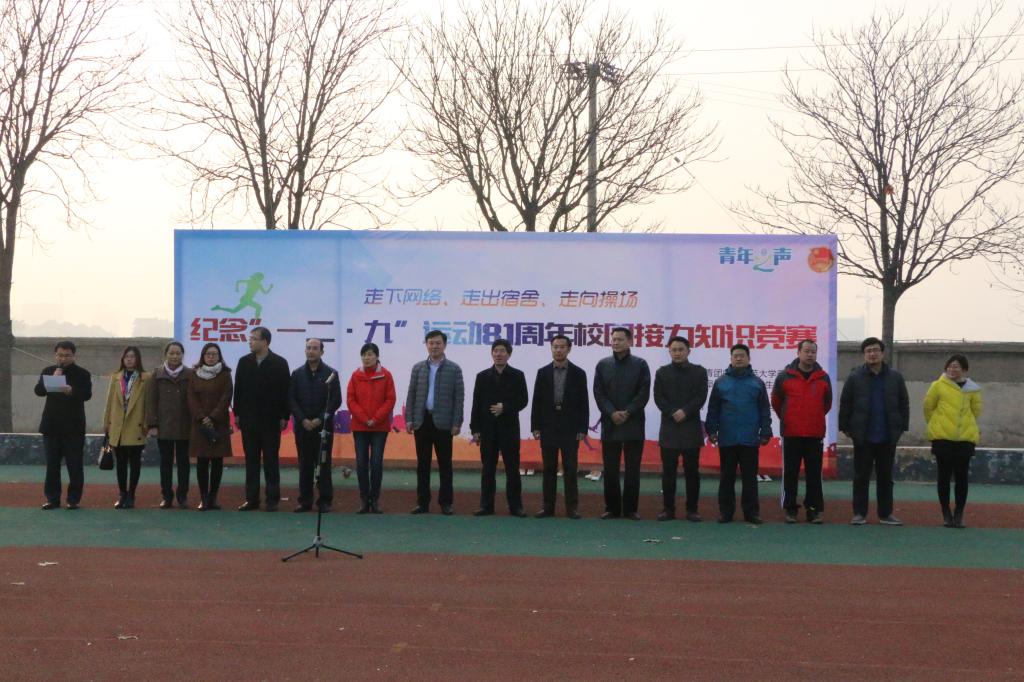 12月8日下午,为纪念“一二·九”救亡运动胜利81周年,由校团委主办的“一二·九”校园接力知识竞赛在西操场顺利举行。学生工作处处长杨永明、保卫处处长左兴才、团委书记屈跃宽、团委副书记张明洁出席开幕式。参加开幕式的还有各富贵险中求