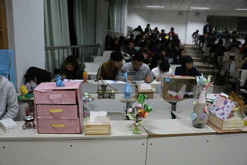 本次参赛作品形式多样,内容丰富,有用废弃的饮料瓶盖制成的象棋棋盘,也有用我们最常见的快递盒、瓜子皮、树叶等制成的精致装饰品,还有用废报纸做成的迷你史迪仔玩偶。每位参赛队员的作品不仅让大家赞叹其奇思妙想,还让大家切实地体会到“垃圾是放错了地方的资源”。在随后的才艺展示环节,婉转的歌声、悠扬的笛声、精彩的才艺表演令掌声和笑声环绕着整个会场,现场气氛十分活跃。活动结束前,学生会主席刘孝迎进行了总结并鼓舞大家将这种环保的精神坚持下去。