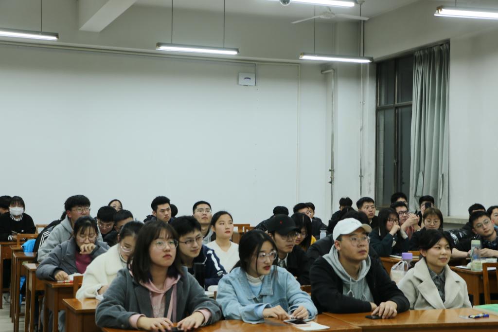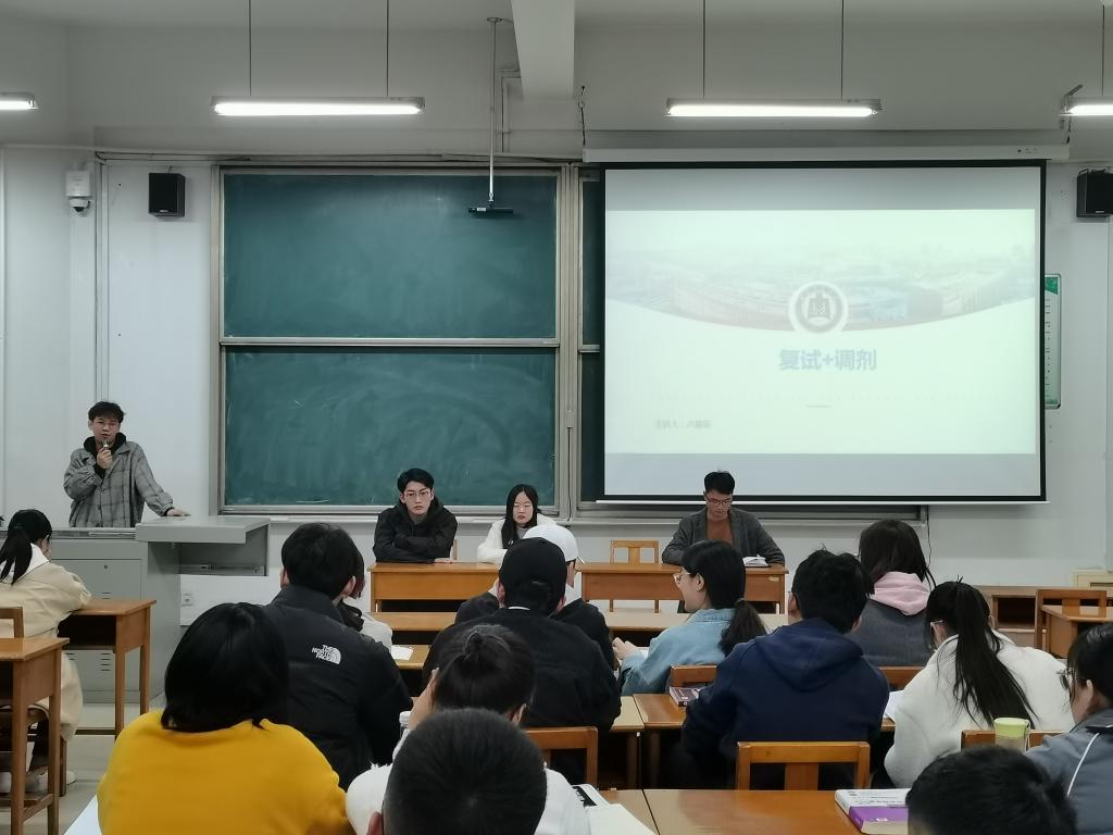 在综合教学楼205举办考研复试经验交流座谈会,毕业生辅导员丁允念老师、研究生桑洪川、卢星辰、范憧憧进行指导,90多名考研同学积极参与。