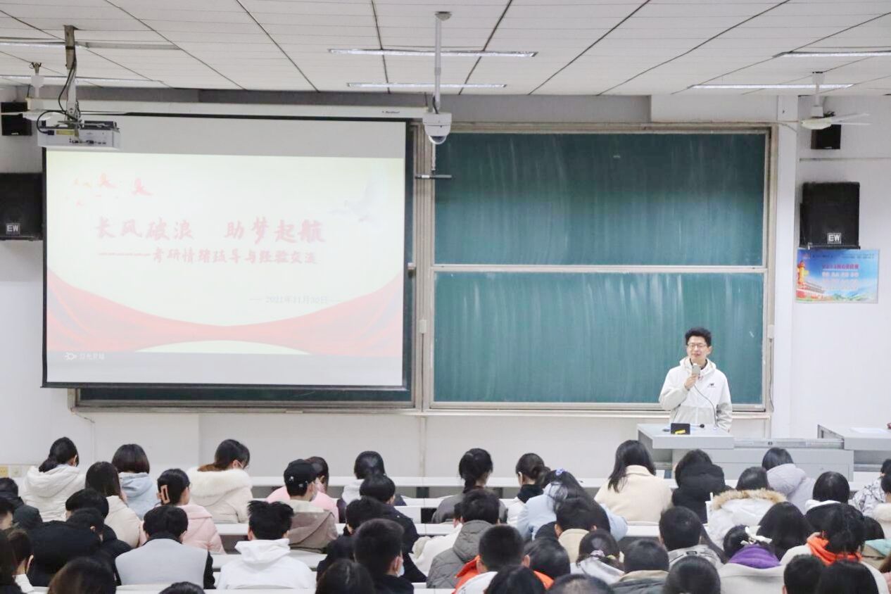 “乘风破浪 助梦起航”考研压力应对和经验交流会综合楼301、306顺利举行。专业老师高鹏、王宇出席会议,交流会由2018级辅导员相青主持。