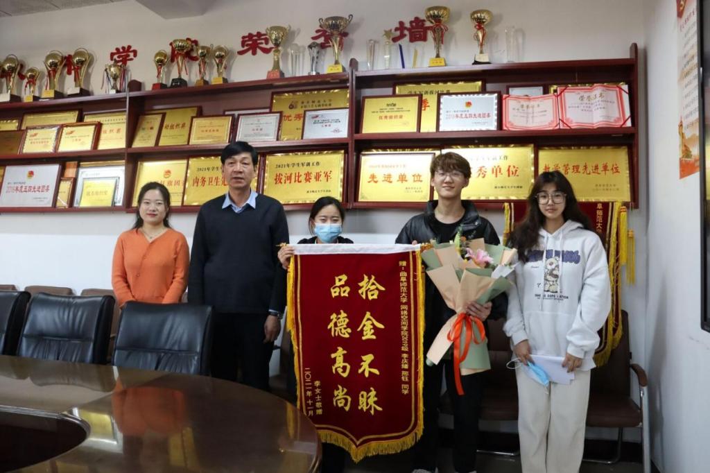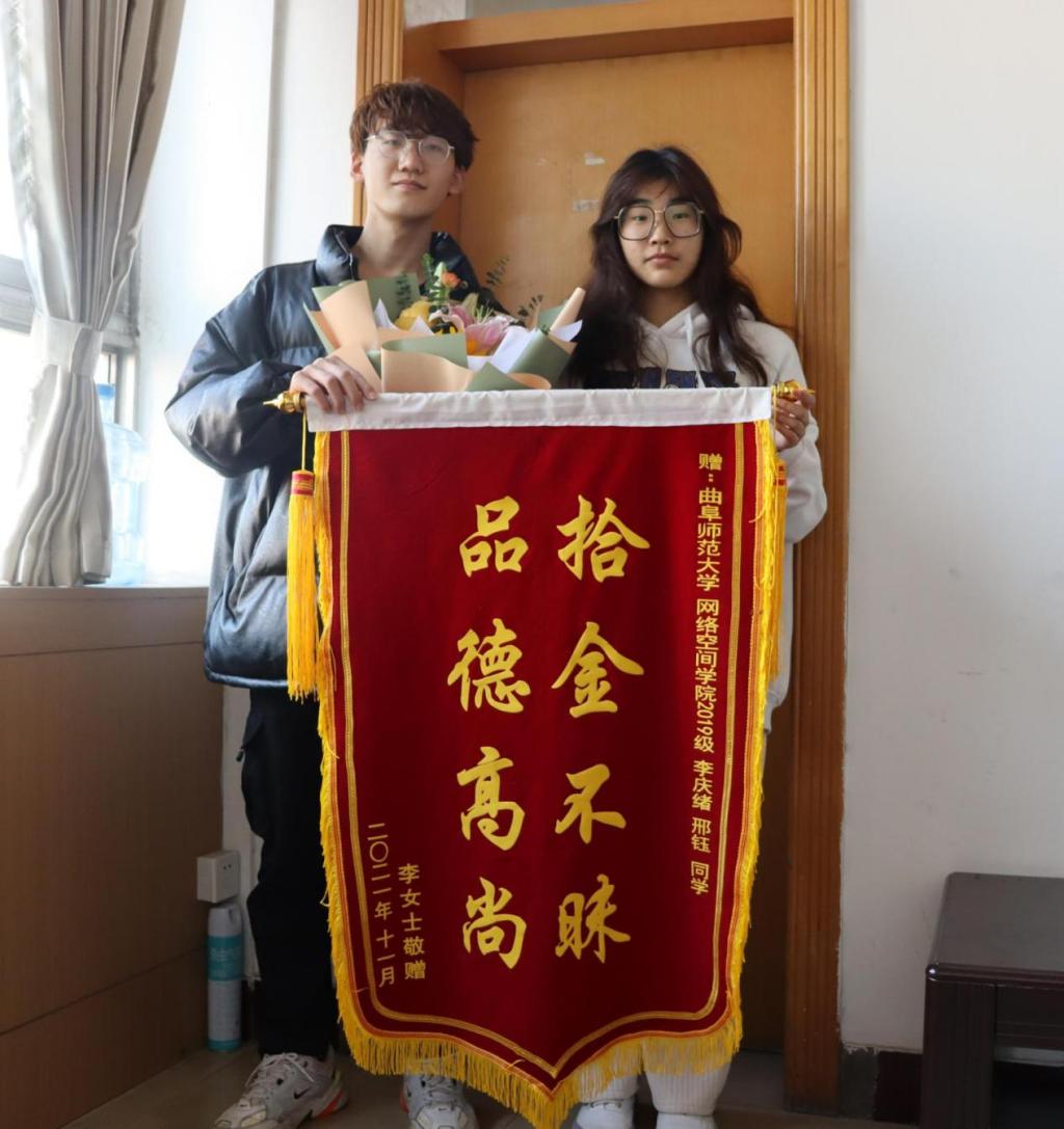 经了解,2021年11月21日晚上,李庆绪和邢钰两位同学在曲阜市蓝海影城附近捡到了苹果手机一部。该手机市场价值九千余元,李庆绪与邢钰捡到手机后,不为钱财所动,第一时间想到的是失主发现手机丢失后的焦急心情,便等待失主返回寻找。最终李女士打来电话,两名同学与失主李女士取得联系,将手机物归原主。就有了上面的一幕,社会人士李女士专程来到富贵险中求