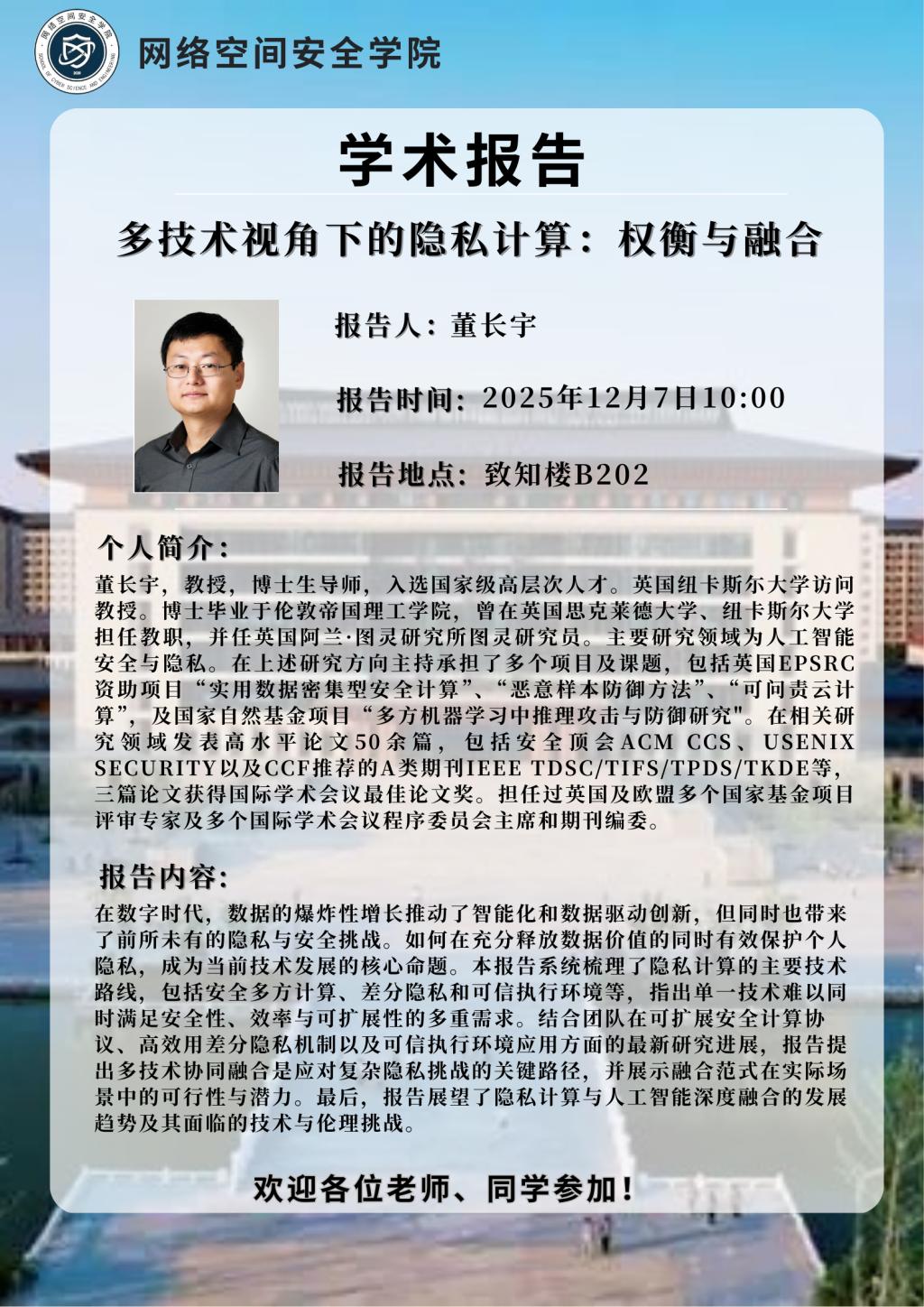 学术讲座:多技术视角下的隐私计算:权衡与融合