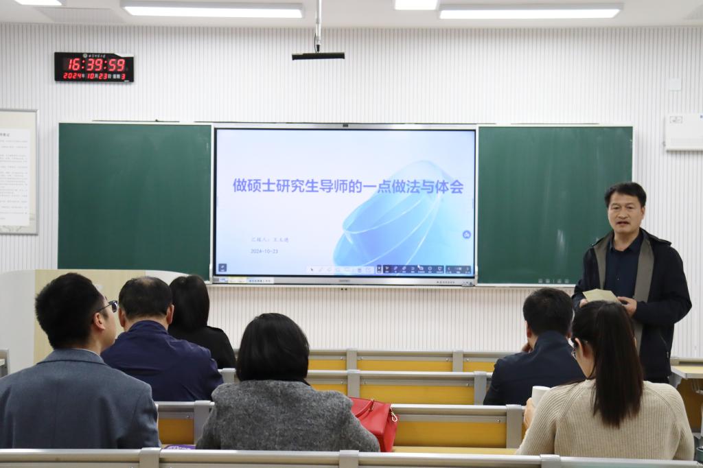 王玉德老师围绕“做硕士研究生导师的一点做法与体会”的主题,从导师的角色与职责、研究生培养、科研指导与论文写作、研究生管理与沟通技巧、研究生培养质量保障五个方面进行了分享。王玉德指出,导师作为研究生培养的第一责任人,不仅要注重专业知识的传授,更要加强思想道德建设,注重培养学生的人文关怀、心理健康和实践能力,争做学生为学、为事、为人示范的“大先生”。